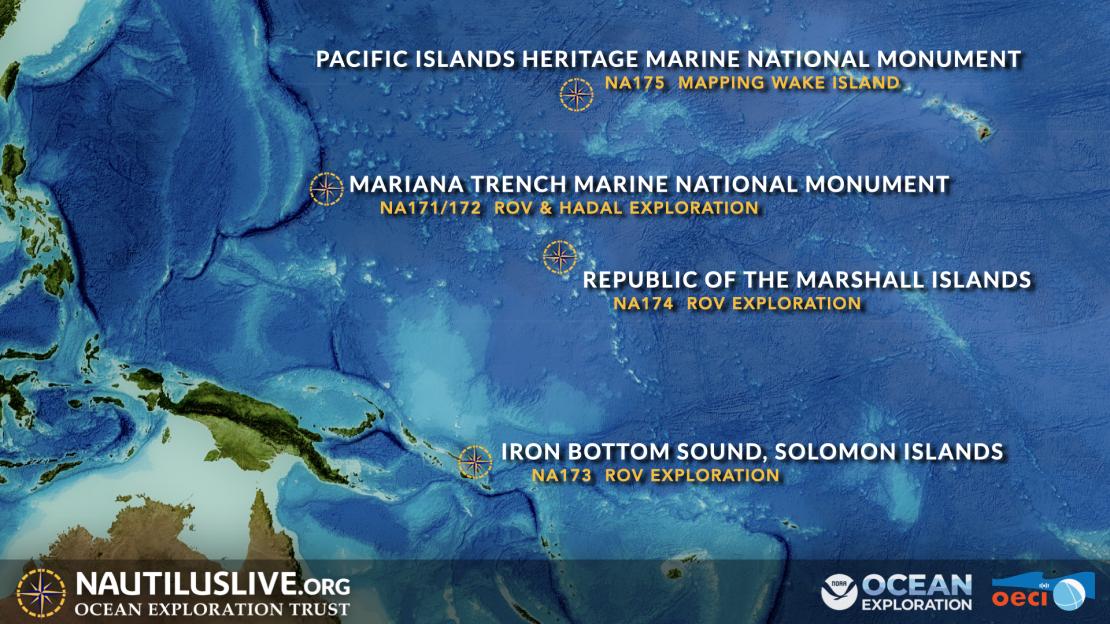 In 2025, E/V Nautilus will explore deep-sea habitats in the Western Pacific using its mapping sonars, ROV systems, and other exploration technologies from partner institutions of the NOAA Ocean Exploration Cooperative Institute. Join us in characterizing deep-sea habitats around Guam, the Commonwealth of the Northern Mariana Islands, the Republic of the Marshall Islands, the Solomon Islands, and more. The goals of these expeditions are codeveloped with national exploration priorities and input from scientists, resource managers, and local communities and stakeholders in the regions where the expeditions will take place.